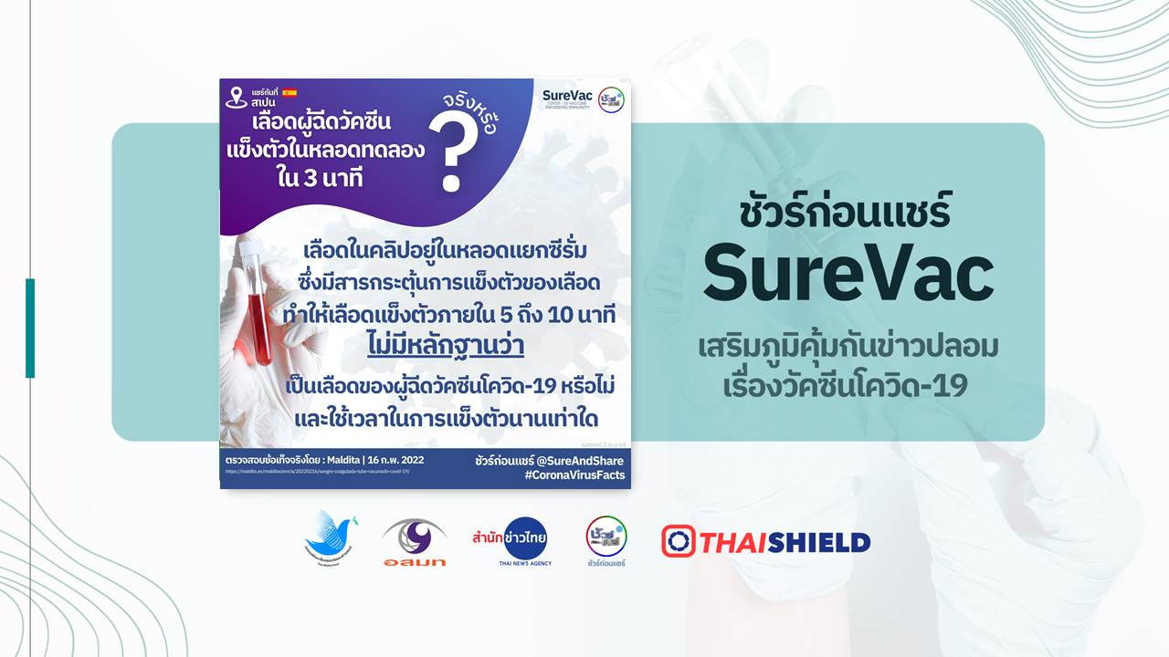มีคลิปวิดีโอข้อมูลเท็จเผยแพร่ทาง Facebook โดยอ้างว่าหลอดบรรจุเลือดที่นำมาจากคนที่ฉีดวัคซีนโควิด-19 แข็งตัวในเวลาเพียงแค่ 3 นาที ซึ่งเป็นเรื่องที่ผิดปกติอย่างมาก โดยอ้างว่าปกติแล้วกว่าเลือดจะแข็งตัวในหลอดต้องใช้เวลาถึง 30 นาที