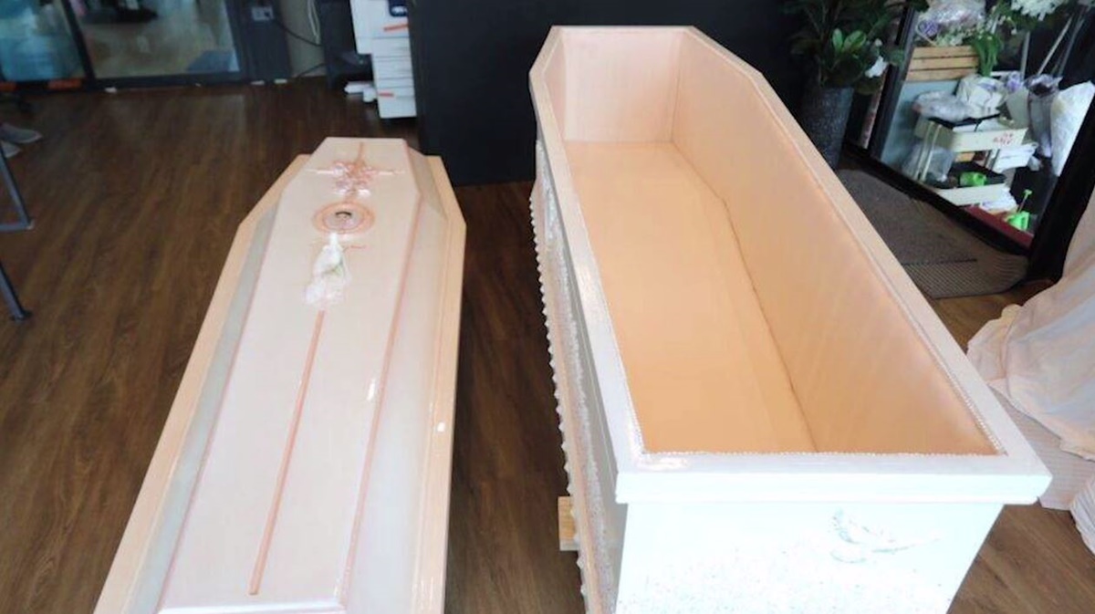 ด้านในหีบ บุด้วยผ้าไหมสีโอลด์โรส ตกแต่งขอบด้วยมุกแบบเรียบง่าย ขณะที่ฝาหีบมีการสลักรูปไม้กางเขน ล้อมด้วยดอกกุหลาบและดอกทิวลิป พร้อมภาพของ “แตงโม” และชื่อที่ถูกแกะสลักเป็นอักษรภาษาอังกฤษ มีนกพิราบปั้นนูนแบบ 3 มิติ ประกอบด้วย โดยทุกจุด ทุกรายละเอียด ล้วนให้ความสำคัญ เพื่อให้หีบบรรจุออกมาสวยงามที่สุด