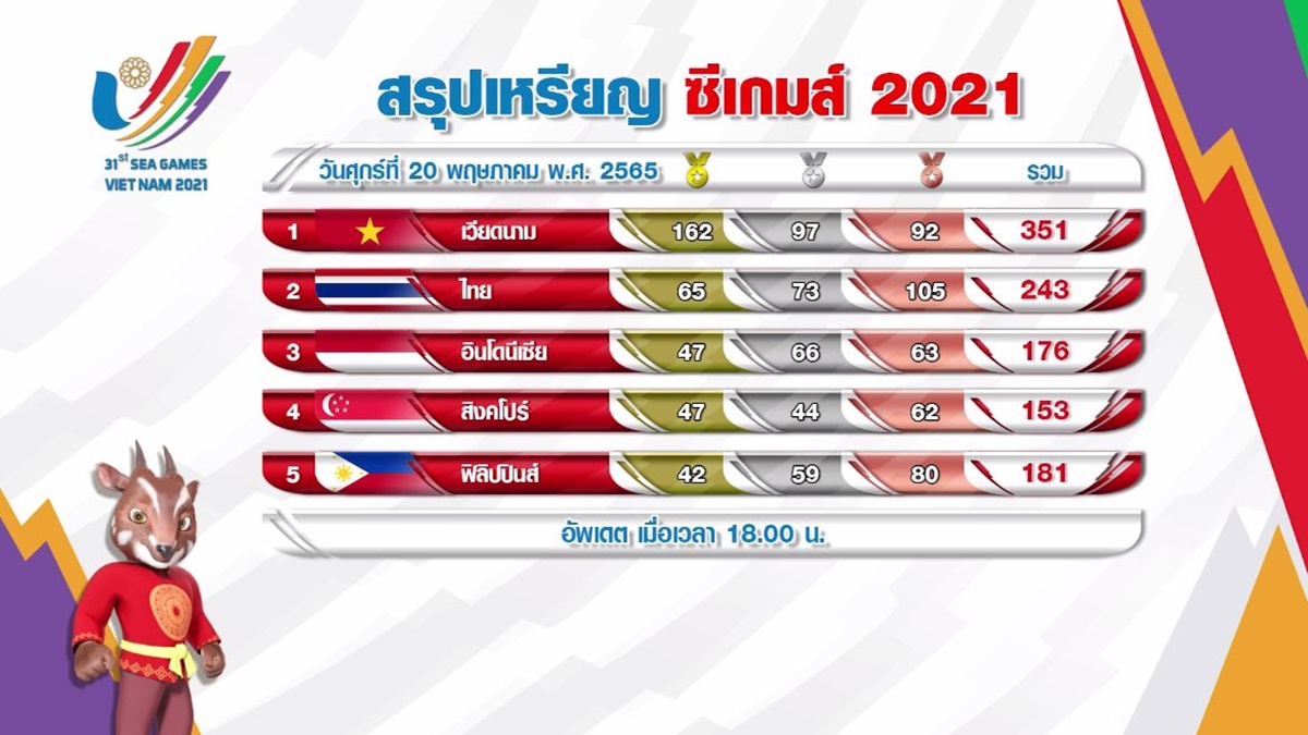 สรุปเหรียญทองซีเกมส์ ครั้งที่ 31 อัปเดตล่าสุด ณ เวลา 18.00 น. วันศุกร์ที่ 20 พฤษภาคม 2565