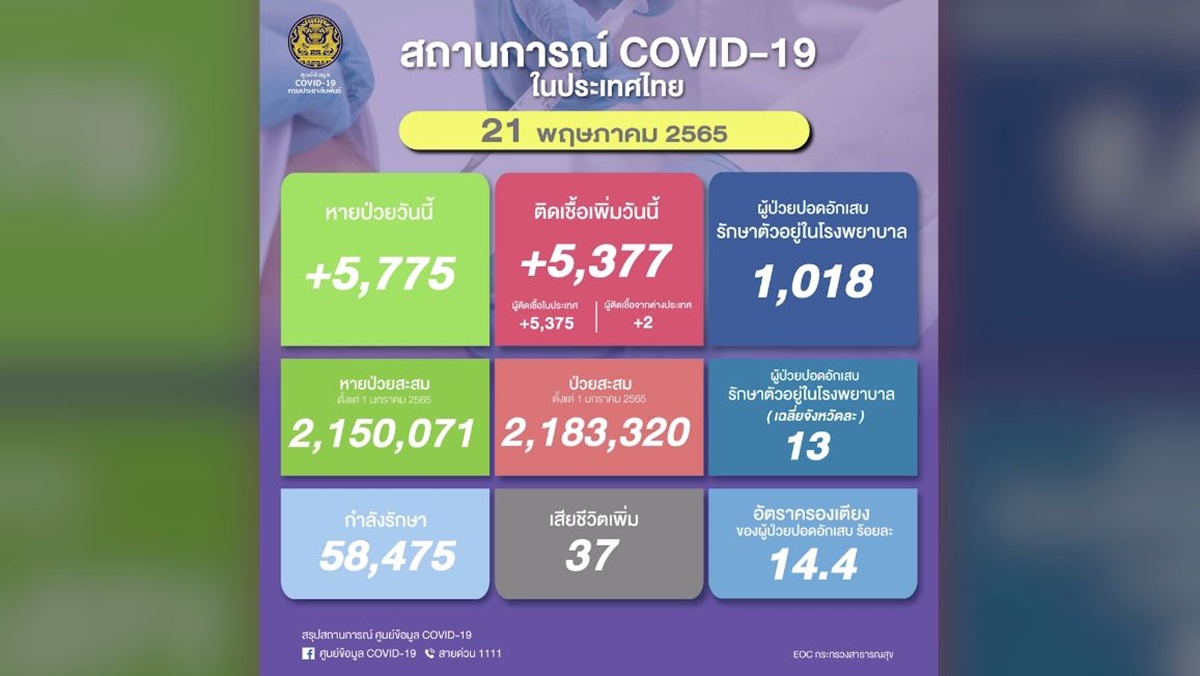 ส่วนสถานการณ์การติดเชื้อโควิด-19 วันนี้ (21 พ.ค.) พบผู้ติดเชื้อเพิ่ม 5,377 ราย เป็นผู้ป่วยติดเชื้อในประเทศ 5,375 ราย ติดเชื้อจากต่างประเทศ 2 ราย ทำให้มีผู้ป่วยสะสม 2,183,320 ราย เหลือผู้ป่วยรักษาตัว 58,475 ราย ในจำนวนนี้เป็นผู้ป่วยปอดอักเสบ 1,018 ราย คิดเป็นอัตราครองเตียง 14.4% และมีผู้เสียชีวิต 37 ราย ขณะที่มีผู้ป่วยรักษาหายวันนี้ 5,775 ราย ยอดหายป่วยสะสม 2,150,071 ราย. – สำนักข่าวไทย