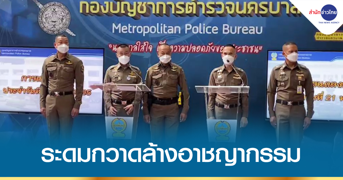 พล.ต.ท.ต่อศักดิ์ สุขวิมล ผู้ช่วยผู้บัญชาการตำรวจแห่งชาติ พร้อมด้วย พล.ต.ท.สำราญ นวลมา ผู้บัญชาการตำรวจนครบาล ร่วมกันแถลงผลระดมกวาดล้างอาชญากรรมในพื้นที่กองบัญชาการตำรวจนครบาล ในช่วงระหว่างวันที่ 9-20 พฤษภาคม 2565 โดยภาพรวมมีการจับกุม 4,312 คดี ได้ผู้ต้องหา 4,347 คน เป็นผู้ต้องหาตามหมายจับ 409 คดี