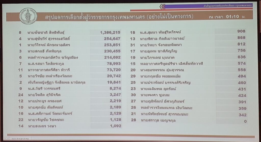 ผลการนับคะแนนผู้ว่าราชการกรุงเทพมหานครปรากฏว่า หมายเลข 8 นายชัชชาติ สิทธิพันธุ์ ผู้สมัครรับเลือกตั้งเป็นผู้ว่าราชการกรุงเทพมหานคร สังกัดอิสระ ได้รับคะแนนเสียงเลือกตั้งสูงสุด จำนวน 1,386,215 คะแนน