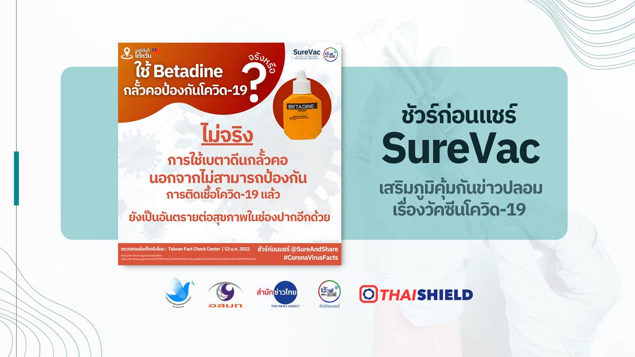 ส่วนการนำยารักษาแผลสดอย่างเบตาดีนมากลั้วคอเพื่อป้องกันโควิด-19 ก็เป็นข่าวลือที่เผยแพร่มาตั้งแต่ปี 2020 จากการตรวจสอบข้อมูลโดย Fact Checker หลายแห่งพบว่า การใช้เบตาดีนที่เป็นยาฆ่าเชื้อสำหรับผิวหนังมากลั้วคอ จะส่งผลเสียต่อปาก, ลิ้น, ริมฝีปาก และลำคอ การใช้เบตาดีนกลั้วคอ นอกจากไม่สามารถป้องกันการติดเชื้อโควิด-19 แล้ว ยังเป็นอันตรายต่อสุขภาพในช่องปากอีกด้วย