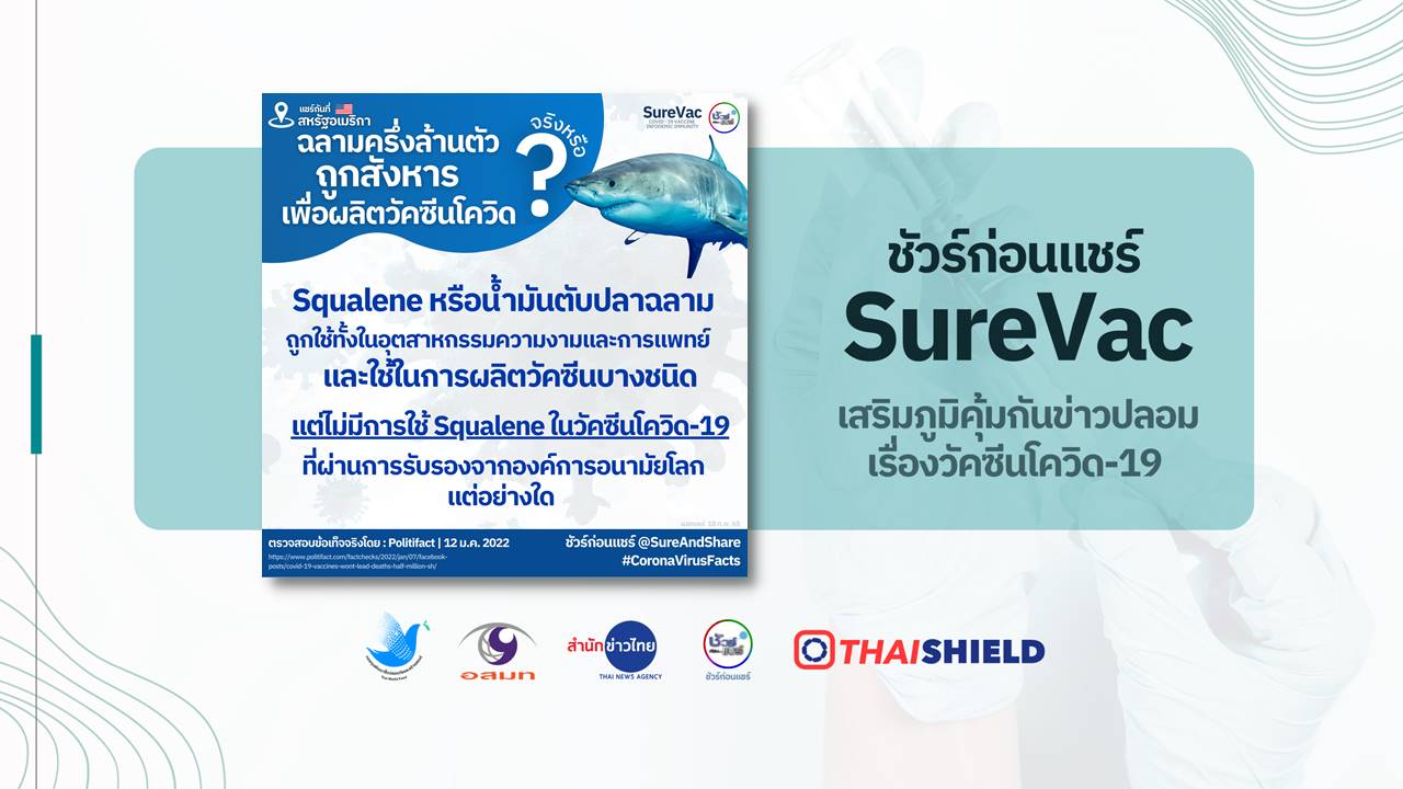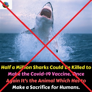 มีข้อมูลเท็จเผยแพร่ทาง Facebook โดยอ้างว่า เพื่อจะผลิตวัคซีนโควิด-19 ในปริมาณที่เพียงพอต่อประชากรโลก จำเป็นต้องสังหารฉลามเกือบ 5 แสนตัวเพื่อนำ Squalene หรือน้ำมันตับปลาฉลามในทะเลน้ำลึกมาใช้เป็นส่วนประกอบของวัคซีนโควิด-19