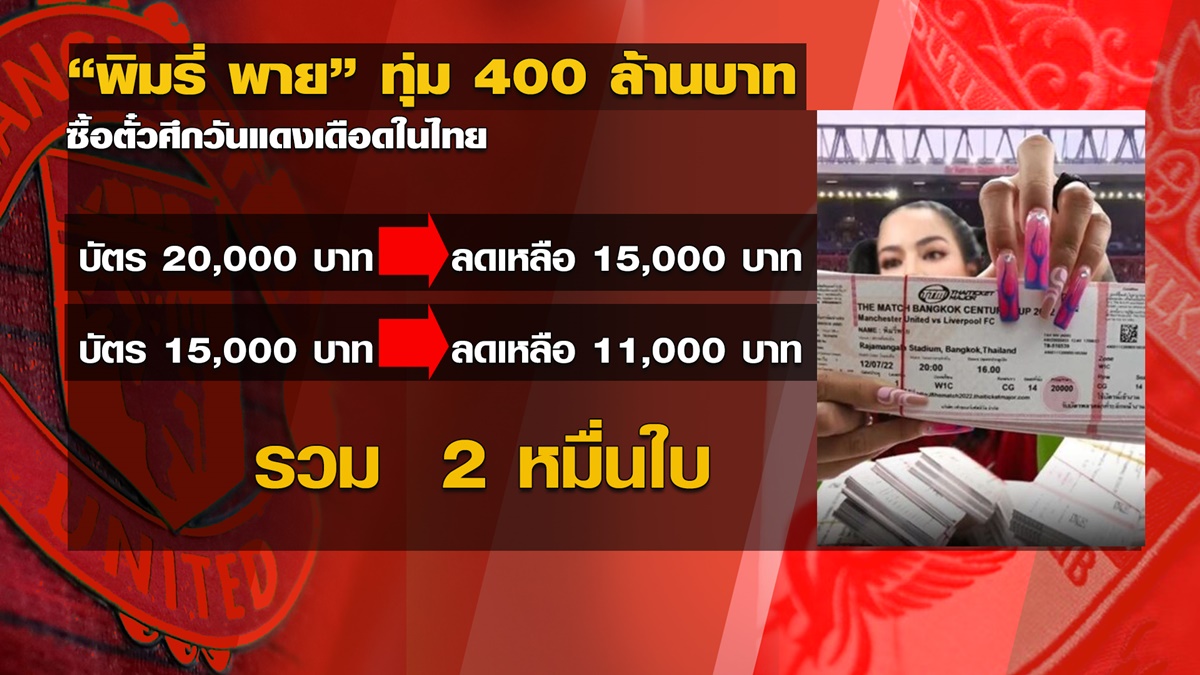 กลายเป็นประเด็นร้อนแรงในช่วงหัวค่ำของวันที่ 23 มิถุนายนที่ผ่านมา หลังจาก “พิมรี่พาย” ออกมาไลฟ์ขายบัตรชมเกมแดงเดือด ระหว่างทีมแมนเชสเตอร์ ยูไนเต็ด กับ ลิเวอร์พูล ที่กรุงเทพฯ The Match Bangkok Century Cup 2022 ซึ่งจะมีขึ้นในวันที่ 12 กรกฎาคม 2565 ที่สนามราชมังคลากีฬาสถาน โดย “พิมรี่พาย” ประกาศว่า มีบัตรอยู่ในมือทั้งสิ้น 20,000 ใบ เป็นบัตรของทั้งฝั่งแมนฯ ยูไนเต็ด และลิเวอร์พูล และมีบัตรซ้อมสำหรับวันที่ 11 กรกฎาคม 2565 อยู่ด้วย รวมมูลค่าทั้งสิ้นราว 400 ล้านบาท และขายแบบลดราคา โดยบัตร 20,000 บาท ขายในราคา 15,000 บาท บัตร 15,000 บาท ขายในราคา 11,000 บาท นอกจากนี้ยังแจกบัตรชมการซ้อมของ “แจ็คสัน หวัง” อีกด้วย โดยมีการนำบัตรเหล่านั้นมากองไว้ให้เห็นด้วยว่า มีชื่อของ “พิมรี่พาย” อยู่ที่บัตร ทำให้เกิดประเด็นดราม่าขึ้นมาว่า “พิมรี่พาย” ได้บัตรเหล่านี้มาได้อย่างไร ทั้งที่ตอนขายบัตรมีการประกาศว่า 1 คน จำกัดซื้อได้แค่ 4 ใบเท่านั้น แต่ “พิมรี่พาย” กลับได้มาถึง 20,000 ใบ รวมถึงการที่ “พิมรี่พาย” ประกาศว่า มีบัตรวันซ้อมของ “แจ็คสัน หวัง” ศิลปินชื่อดังจาก GOT7 และจะได้กินข้าวร่วมกับ “แจ็คสัน หวัง” รวมทั้งนักเตะของทั้ง 2 ทีมด้วย