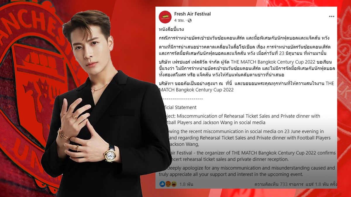 “ตามที่มีการนำเสนอข่าวคลาดเคลื่อนในสื่อโซเชียล เรื่อง การจำหน่ายบัตรวันซ้อมคอนเสิร์ต และการจัดมื้อพิเศษกับนักฟุตบอลและแจ็คสัน หวัง เมื่อค่ำวันที่ 23 มิถุนายนที่ผ่านมานั้น บริษัท เฟรชแอร์ เฟสติวัล จำกัด ผู้จัด THE MATCH Bangkok Century Cup 2022 ขอเรียนชี้แจงว่า ไม่มีการจำหน่ายบัตรเข้าชมวันซ้อมคอนเสิร์ต และไม่มีการจัดมื้อพิเศษกับนักฟุตบอลทั้งสองสโมสร หรือ แจ็คสัน หวัง ให้กับแฟนคลับตามข่าวที่นำเสนอ