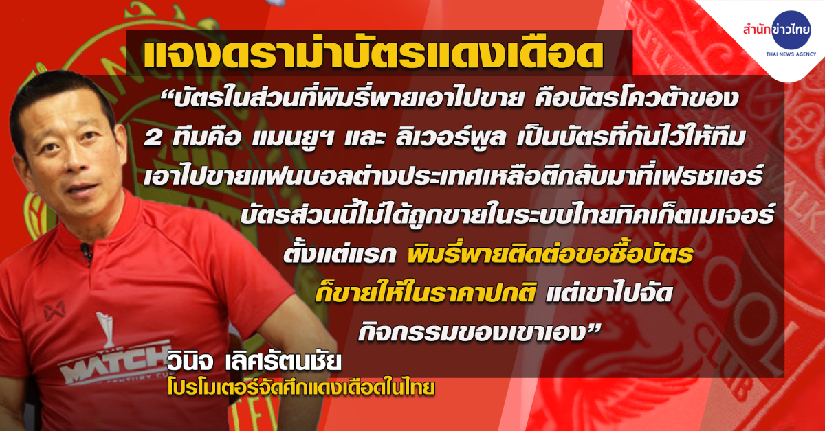 ล่าสุดในคืนวันเดียวกัน “วินิจ เลิศรัตนชัย” ผู้บริหารบริษัท เฟรชแอร์ เฟสติวัล จำกัด ในฐานะผู้จัดการแข่งขัน THE MATCH Bangkok Century Cup 2022 ได้ชี้แจงถึงประเด็นดังกล่าวว่า บัตรชมฟุตบอลที่ “พิมรี่พาย” นำมาไลฟ์ขายนั้น เป็นบัตรโควตาของทั้งแมนฯ ยูไนเต็ด และลิเวอร์พูล ที่เอาไปขายแฟนบอลในต่างประเทศ ทว่าขายได้ไม่หมด โดยเหลือและถูกตีกลับมาที่บริษัท เฟรชแอร์ฯ ซึ่งบัตรเหล่านี้ไม่ได้ขายในระบบไทยทิคเก็ตฯ ตั้งแต่แรกอยู่แล้ว และเป็นจังหวะเดียวกันกับที่ “พิมรี่พาย” ติดต่อขอซื้อบัตร ก็ขายให้ในราคาปกติ ก่อนที่เจ้าตัวจะนำไปจัดกิจกรรมเอง