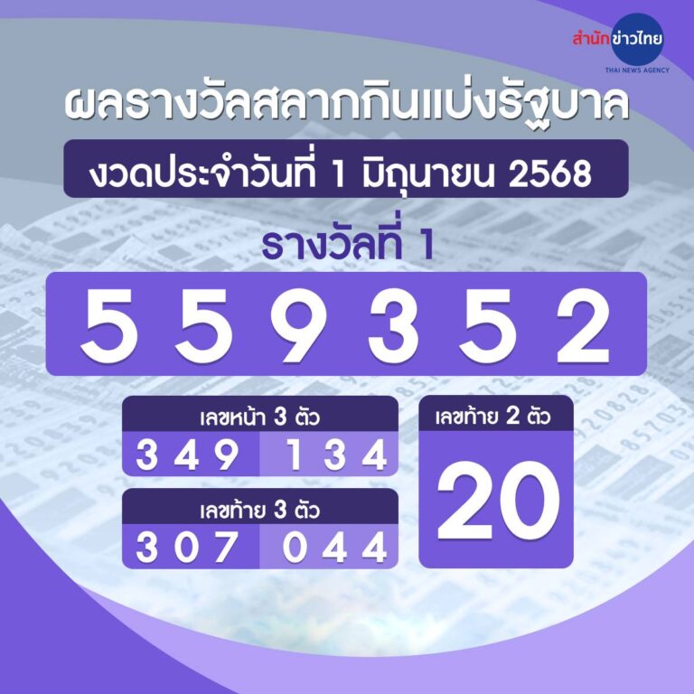 ผลรางวัลสลากกินแบ่งรัฐบาล งวดวันที่ 1 มิถุนายน 2568