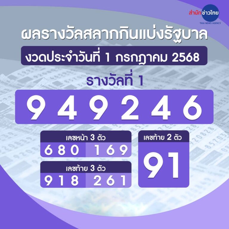 ผลรางวัลสลากกินแบ่งรัฐบาล งวดวันที่ 1 สิงหาคม 2568