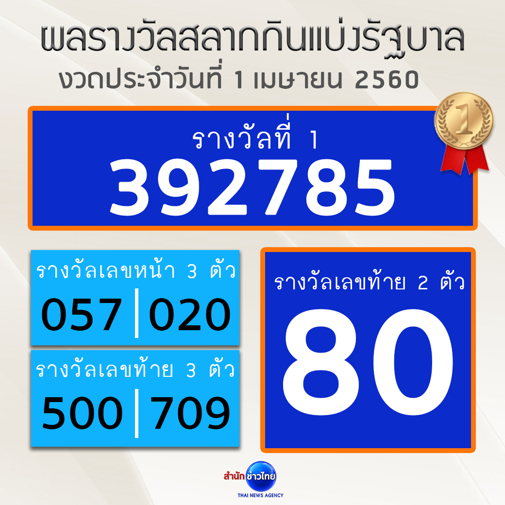 ผลการออกรางวัลสลากกินแบ่งรัฐบาล งวดประจำวันที่ 1 เมษายน 2560