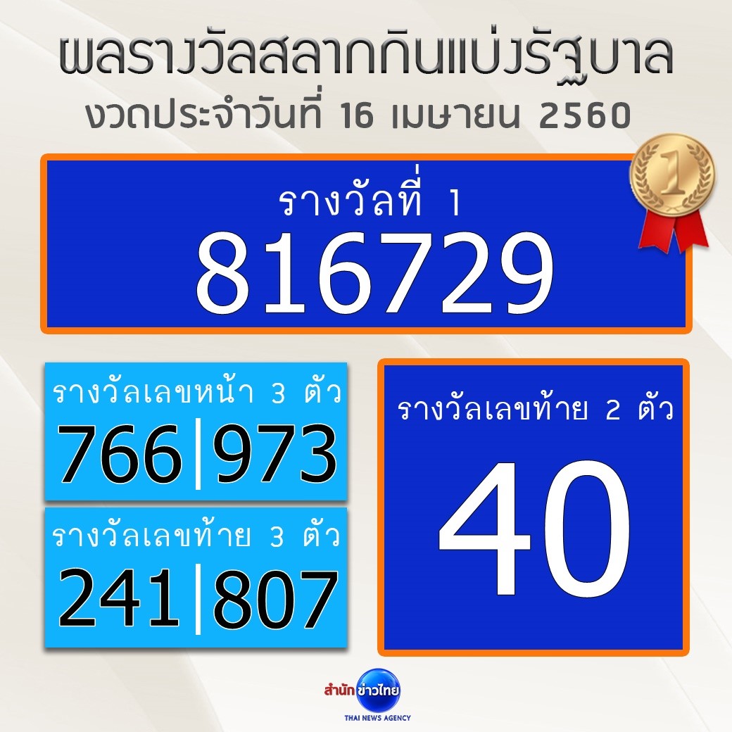 ผลการออกรางวัลสลากกินแบ่งรัฐบาล งวดประจำวันที่ 16 เมษายน 2560