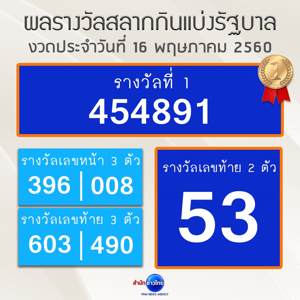 ผลการออกรางวัลสลากกินแบ่งรัฐบาล งวดประจำวันที่ 16 พฤษภาคม 2560