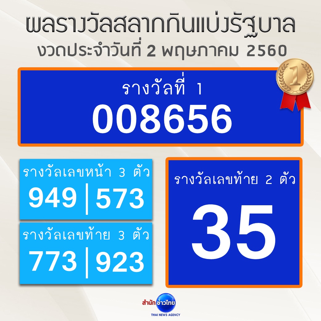 ผลการออกรางวัลสลากกินแบ่งรัฐบาล งวดประจำวันที่ 2 พฤษภาคม 2560