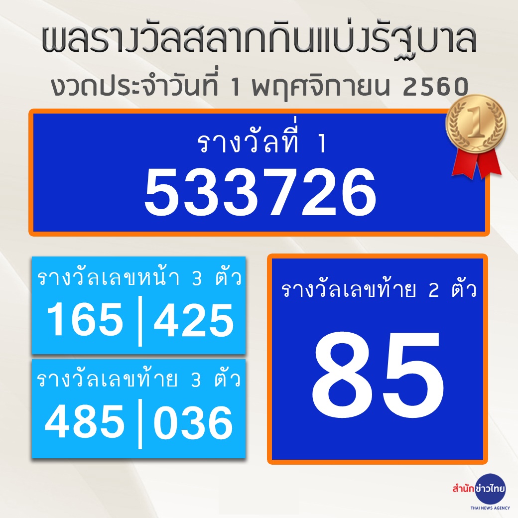 ผลการออกรางวัลสลากกินแบ่งรัฐบาล งวดประจำวันที่ 1 พฤศจิกายน 2560