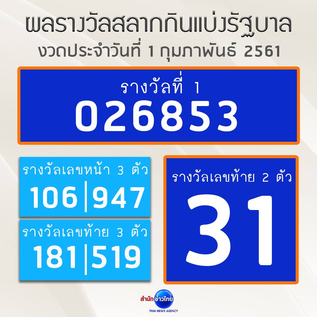 ผลรางวัลสลากกินแบ่งรัฐบาล งวดประจำวันที่ 1 กุมภาพันธ์ 2561