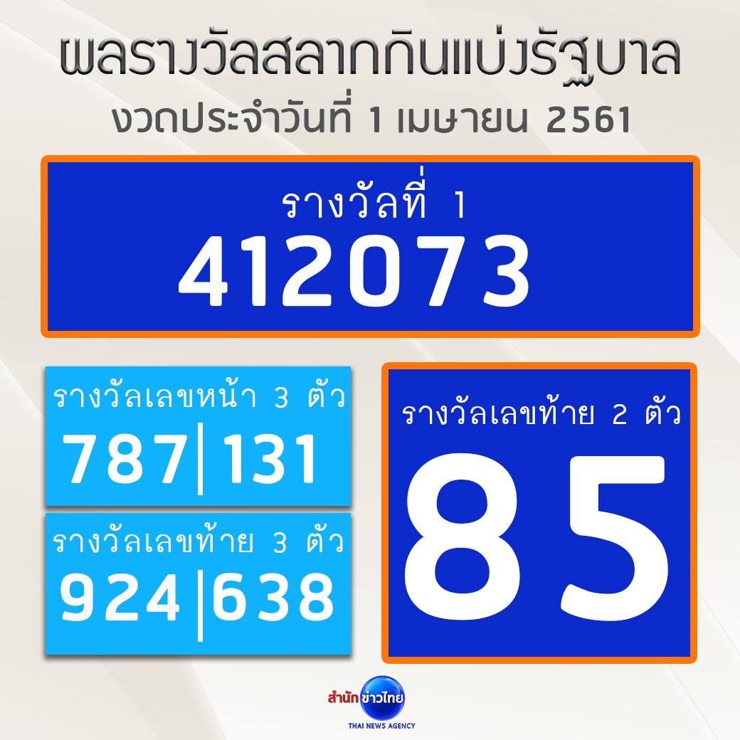 ผลการออกรางวัลสลากกินแบ่งรัฐบาล งวดประจำวันที่ 1 เมษายน 2561