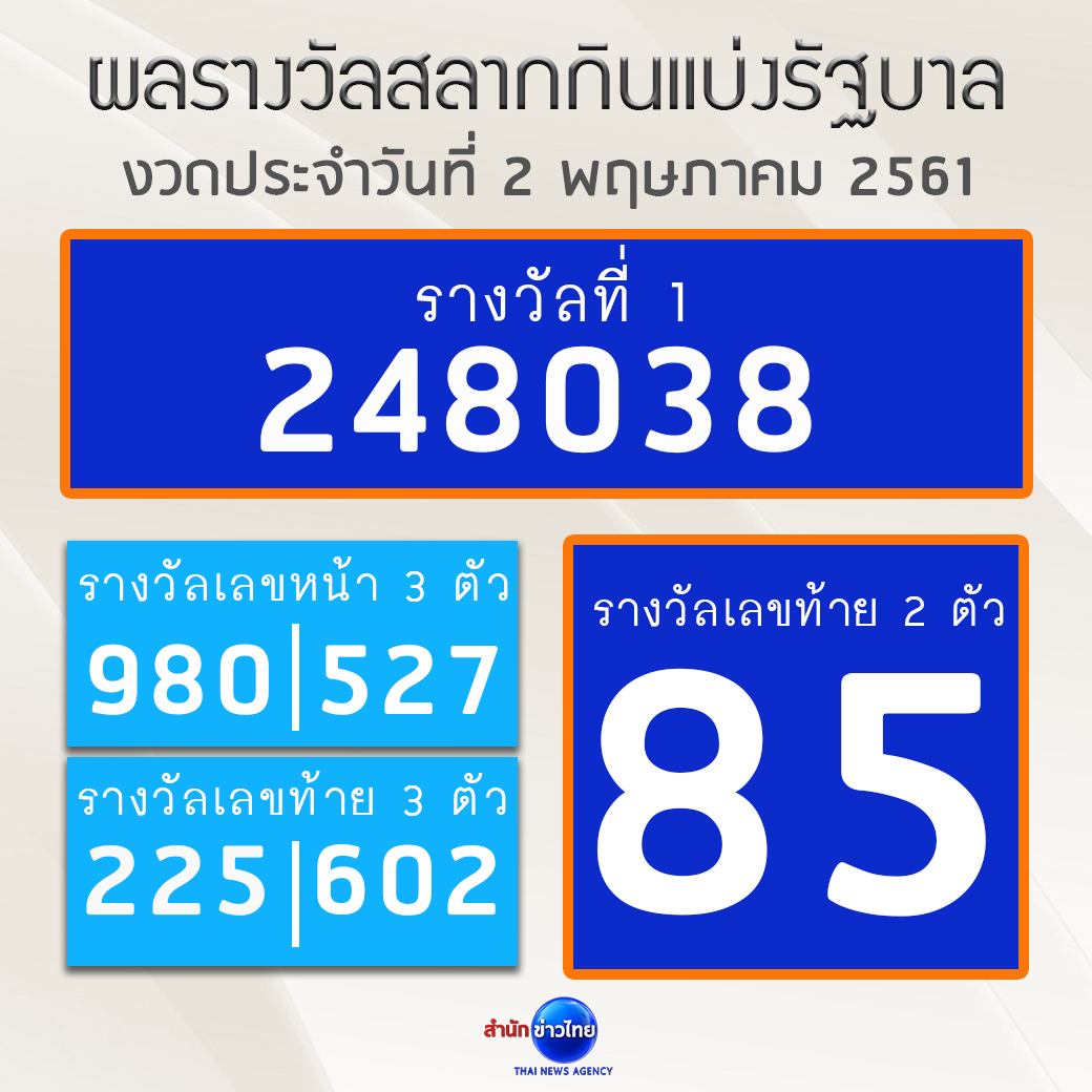 ผลรางวัลสลากกินแบ่งรัฐบาล งวดประจำวันที่ 2 พฤษภาคม 2561