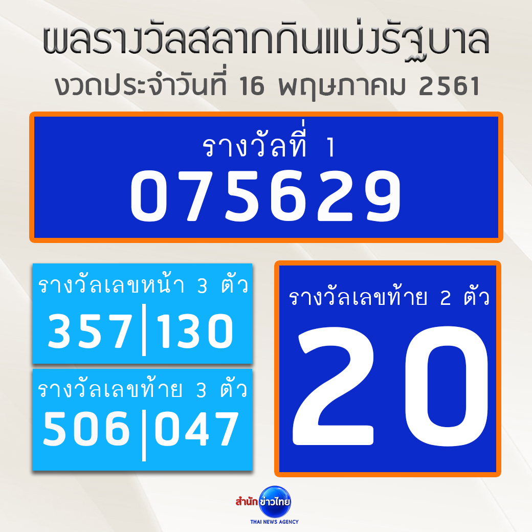 ผลรางวัลสลากกินแบ่งรัฐบาล งวดประจำวันที่ 16 พฤษภาคม 2561