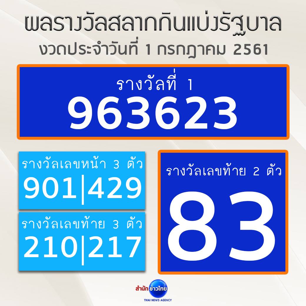 ผลรางวัลสลากกินแบ่งรัฐบาล งวดประจำวันที่ 1 กรกฎาคม 2561