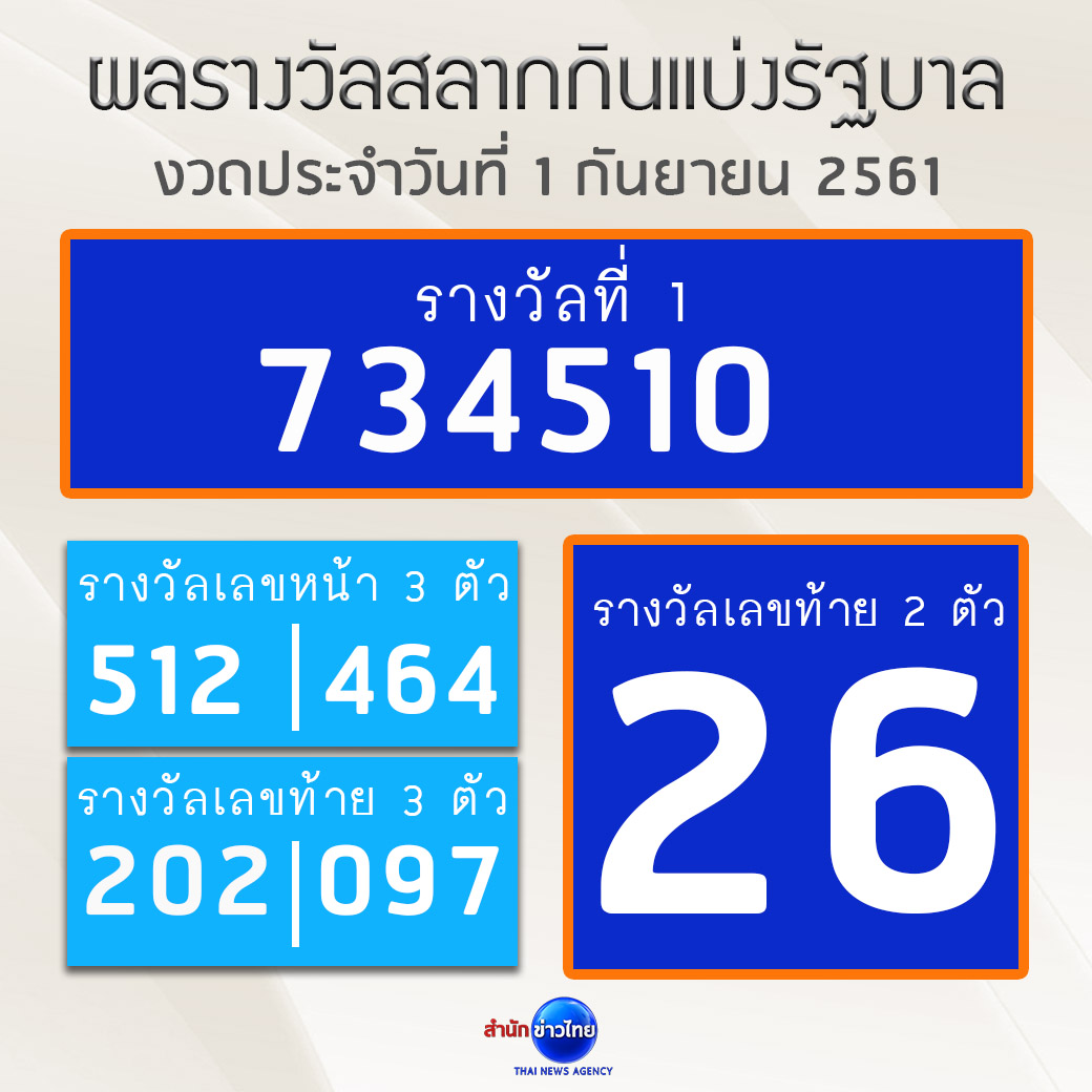 ผลรางวัลสลากกินแบ่งรัฐบาล งวดประจำวันที่ 1 กันยายน 2561