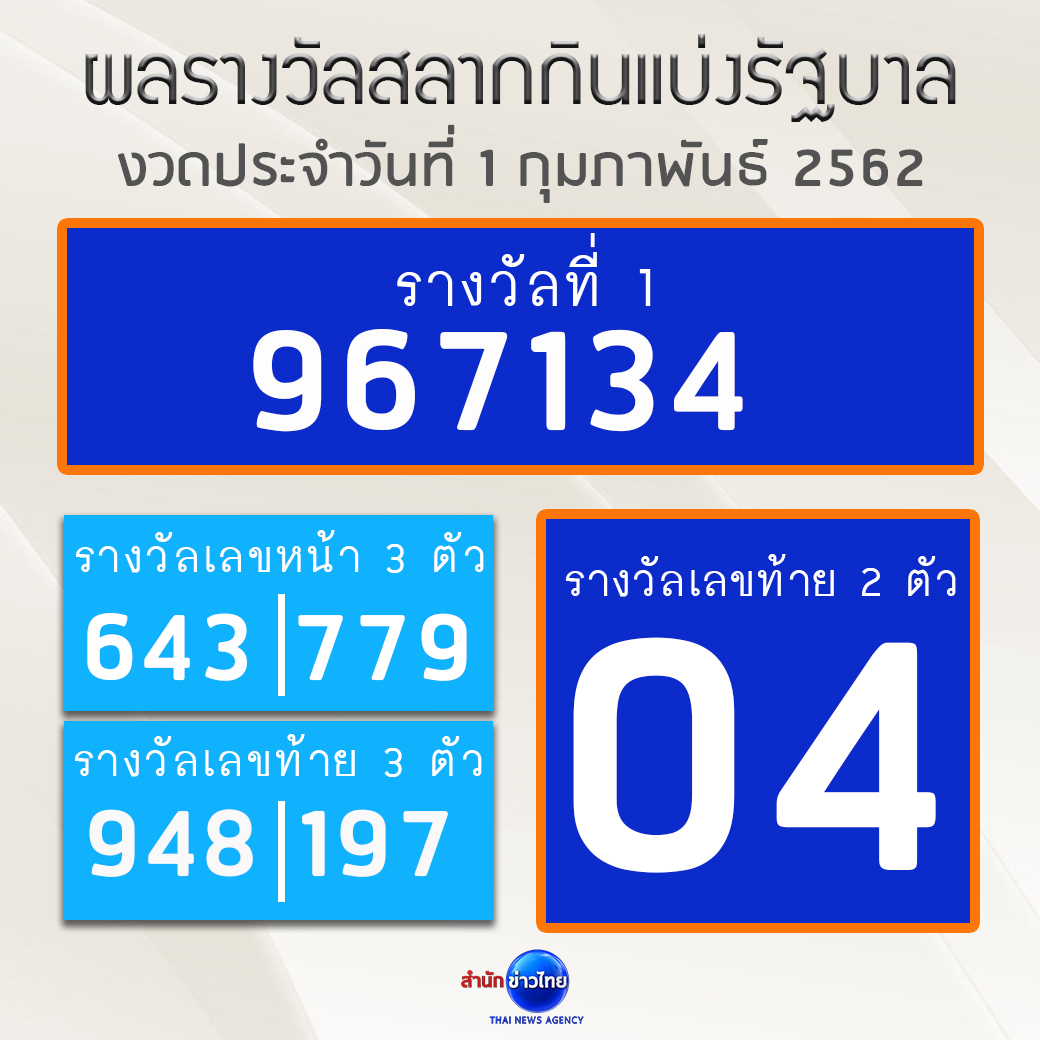 ผลการออกรางวัลสลากกินแบ่งรัฐบาล งวดประจำวันที่ 1 กุมภาพันธ์ 2562