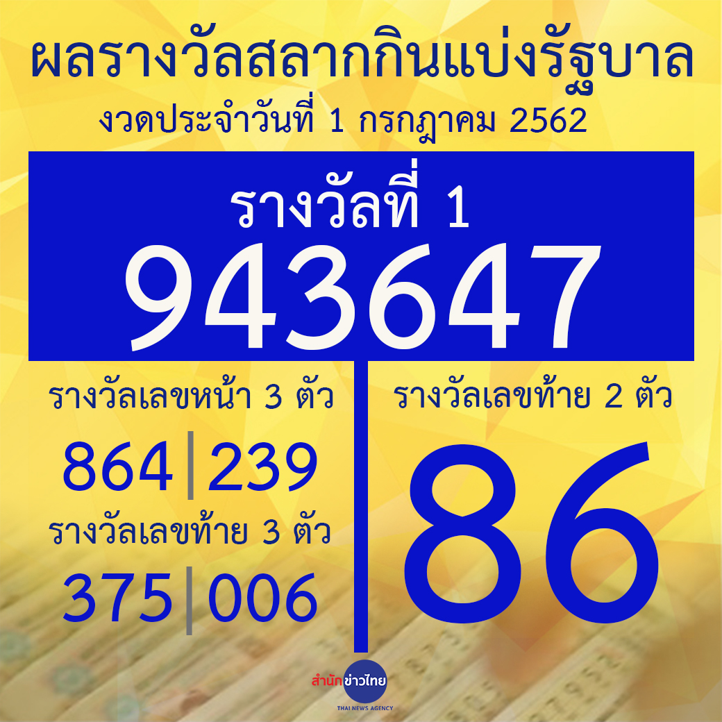 ผลรางวัลสลากกินแบ่งรัฐบาล ประจำวันที่ 1 กรกฎาคม 2562