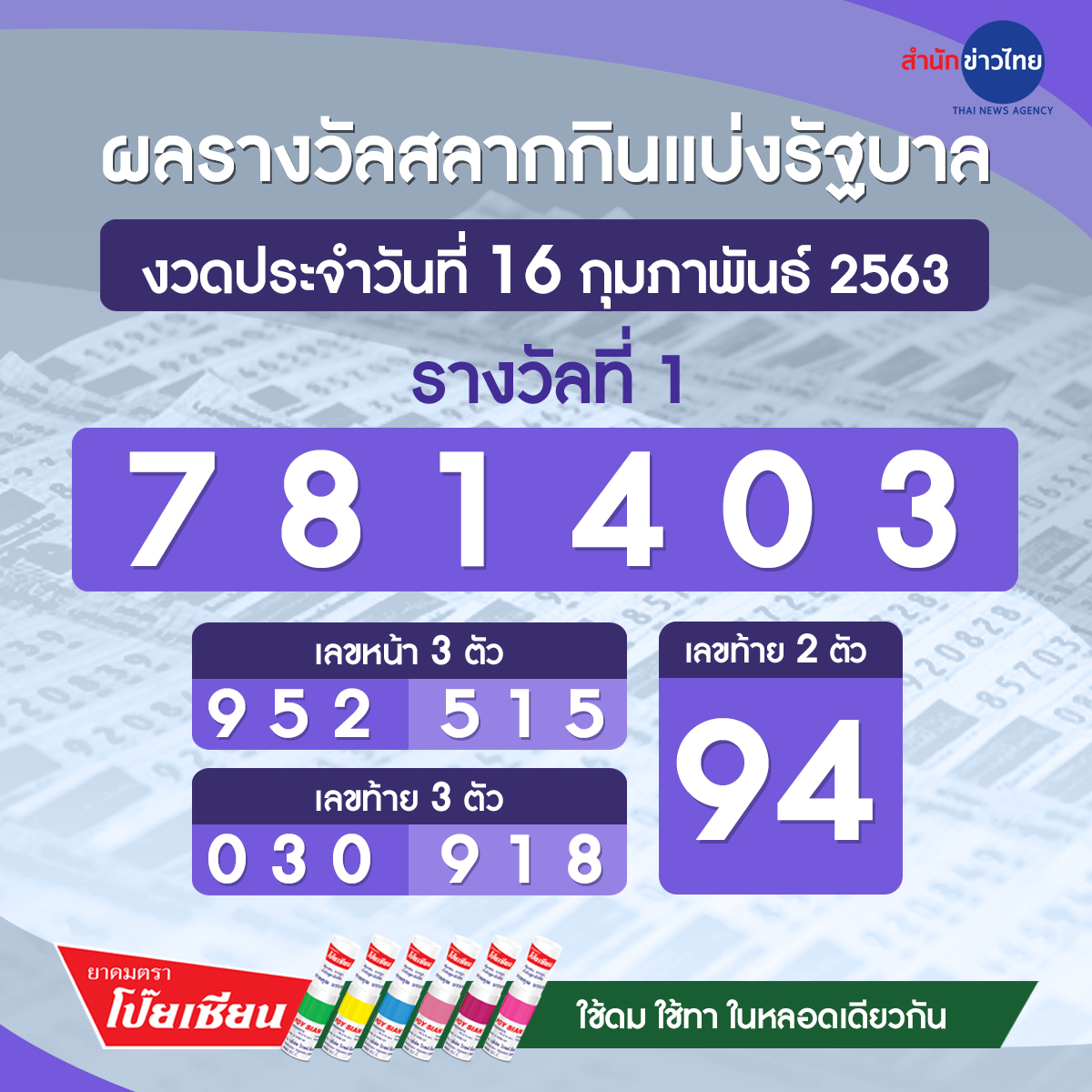 ผลรางวัลสลากกินแบ่งรัฐบาล ประจำวันที่ 16 กุมภาพันธ์ 2563 #ผลหวย #หวย #หวยออก