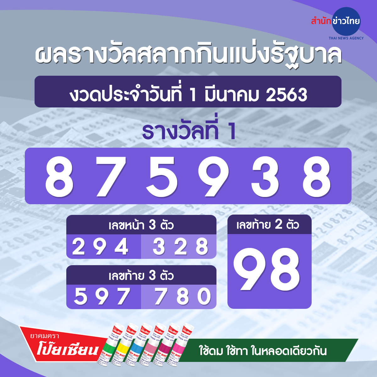 ผลรางวัลสลากกินแบ่งรัฐบาล ประจำวันที่ 1 มีนาคม 2563