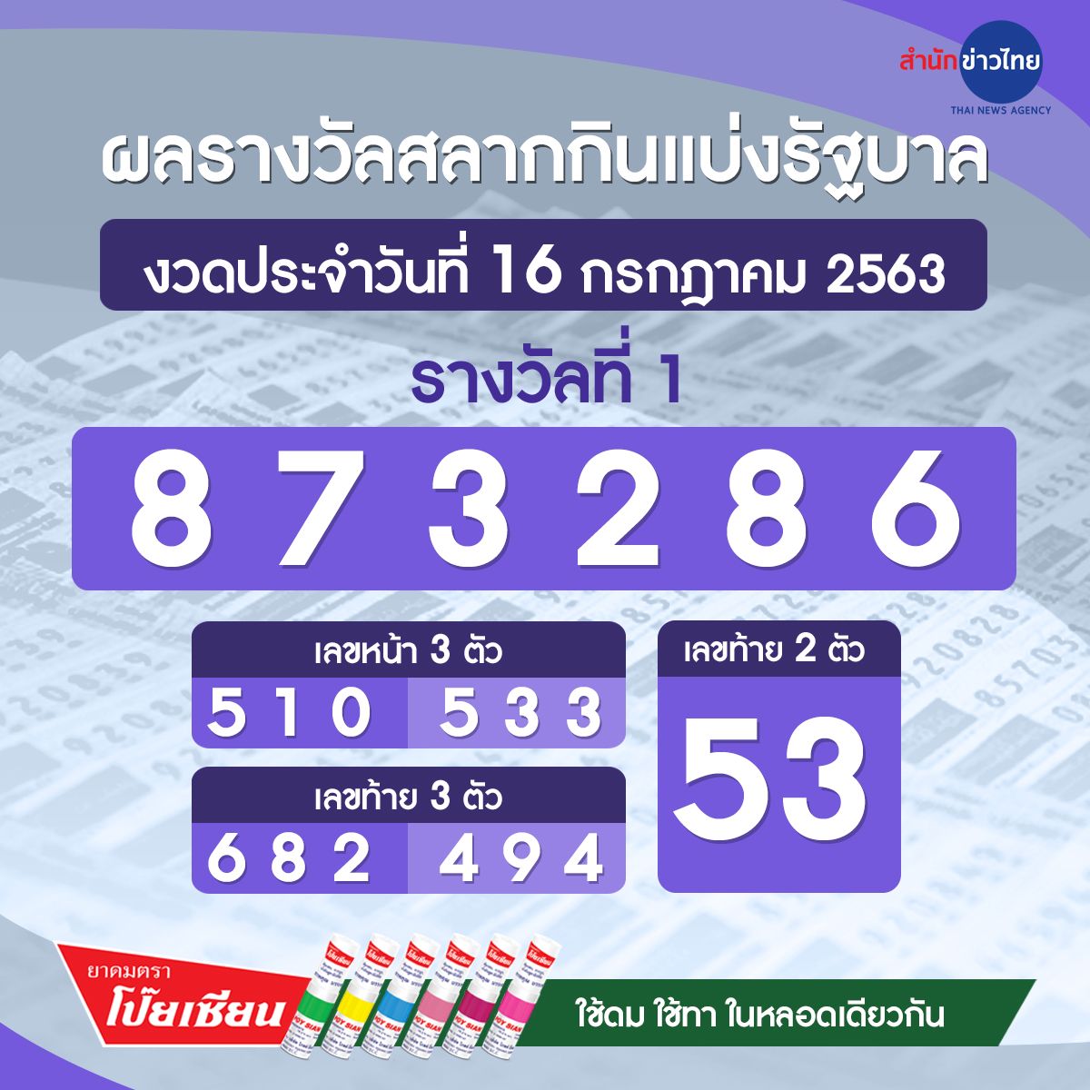 ผลรางวัลสลากกินแบ่งรัฐบาล งวดวันที่ 16 กรกฎาคม 2563