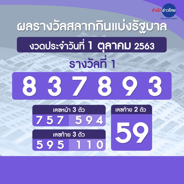 ผลรางวัลสลากกินแบ่งรัฐบาล งวดวันที่ 1 ตุลาคม 2563
