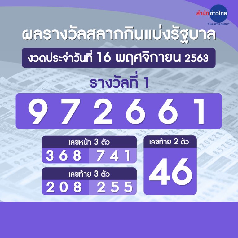 ผลรางวัลสลากกินแบ่งรัฐบาล งวดวันที่ 16 พฤศจิกายน 2563