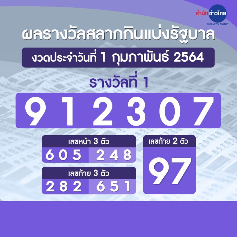 ผลรางวัลสลากกินแบ่งรัฐบาล งวดวันที่ 1 กุมภาพันธ์ 2564