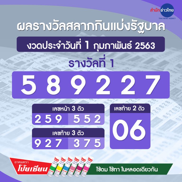 ผลรางวัลสลากกินแบ่งรัฐบาล ประจำวันที่ 1 กุมภาพันธ์ 2563