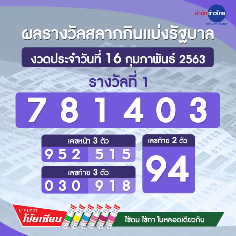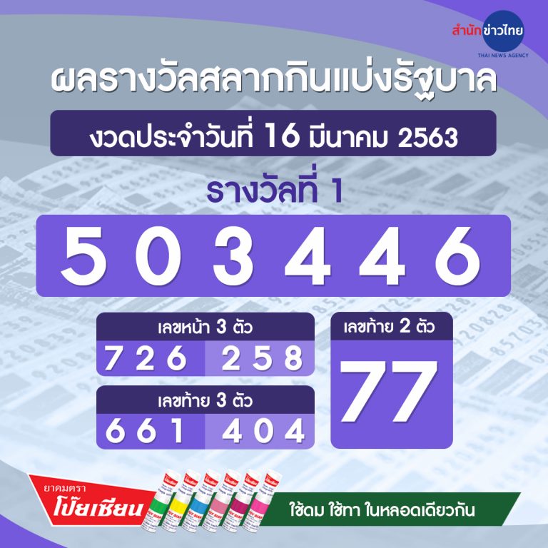 ผลรางวัลสลากกินแบ่งรัฐบาล ประจำวันที่ 16 มีนาคม 2563