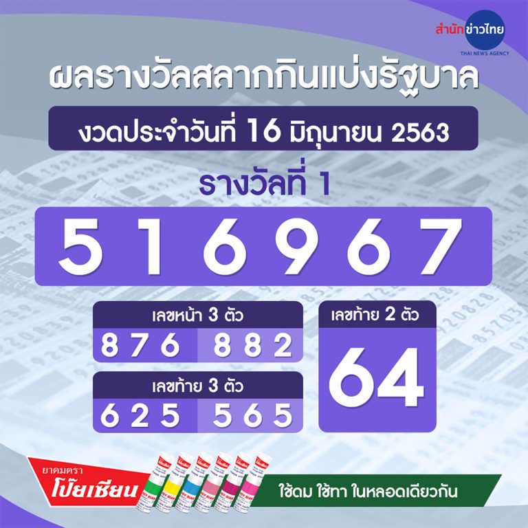 ผลรางวัลสลากกินแบ่งรัฐบาล งวดประจำวันที่ 16 มิถุนายน 2563