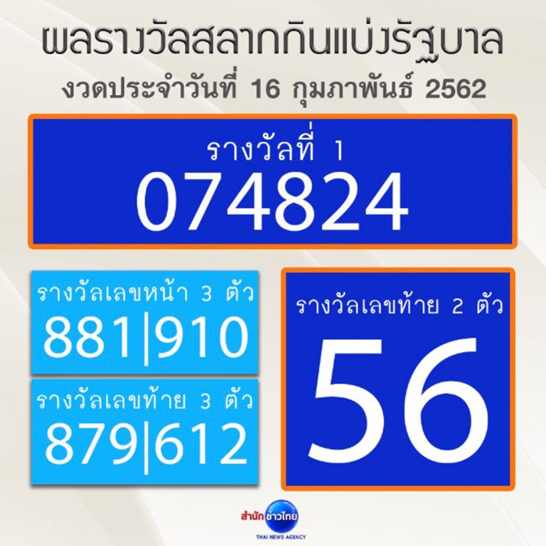 ผลการออกรางวัลสลากกินแบ่งรัฐบาล งวดประจำวันที่ 16 กุมภาพันธ์ 2562