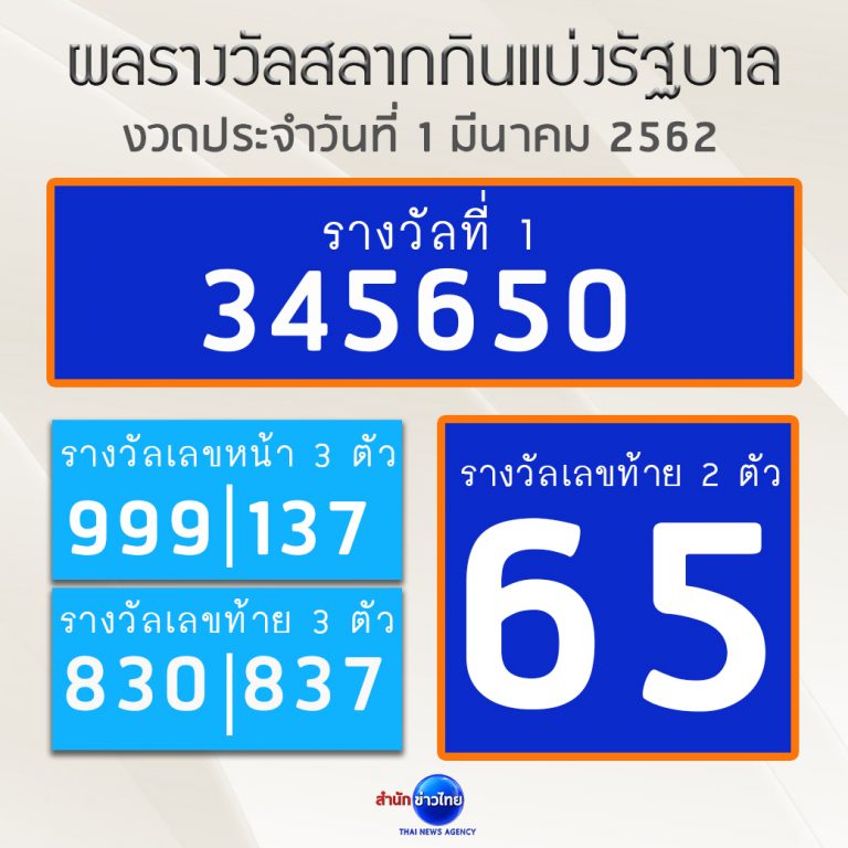 ผลรางวัลสลากกินแบ่งรัฐบาล งวดประจำวันที่ 1 มีนาคม 2562