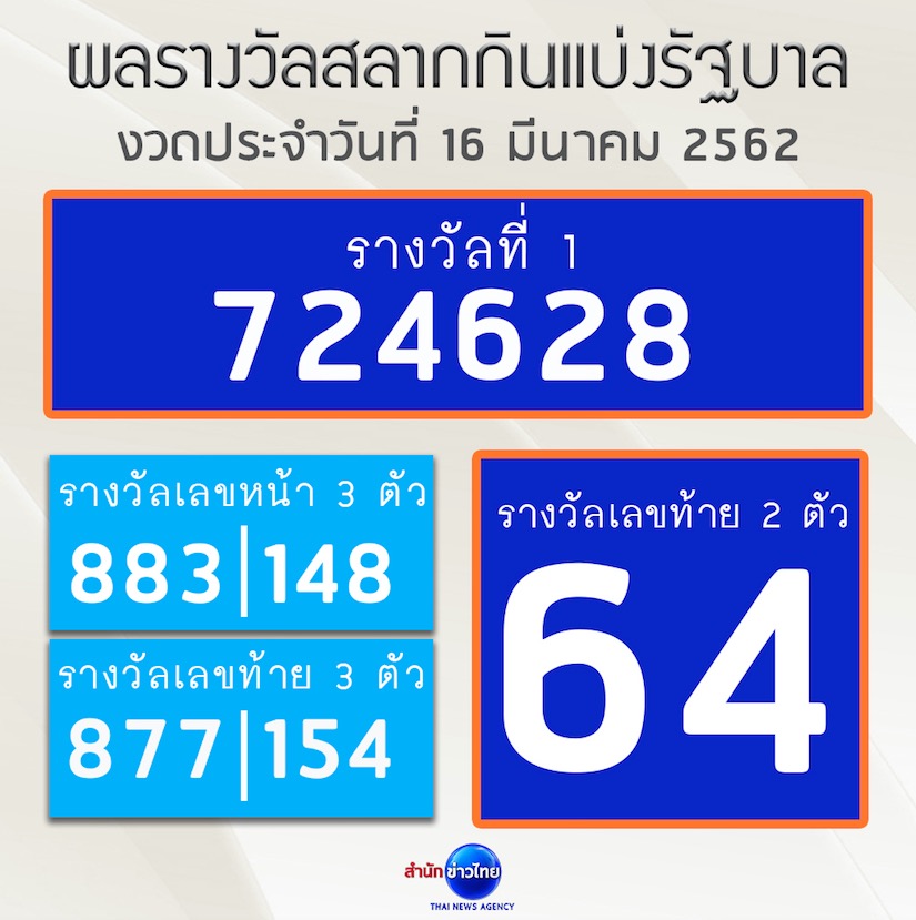 ผลรางวัลสลากกินแบ่งรัฐบาล งวดประจำวันที่ 16 มีนาคม 2562