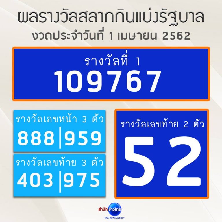 ผลรางวัลสลากกินแบ่งรัฐบาล งวดประจำวันที่ 1 เมษายน 2562
