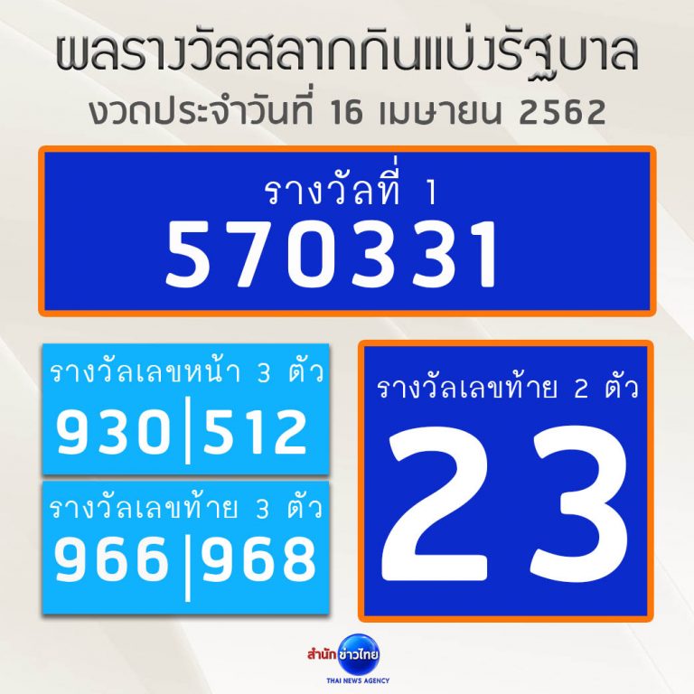 ผลรางวัลสลากกินแบ่งรัฐบาล งวดประจำวันที่ 16 เมษายน 2562