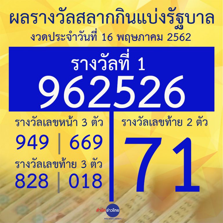 ผลรางวัลสลากกินแบ่งรัฐบาล งวดประจำวันที่ 16 พฤษภาคม 2562