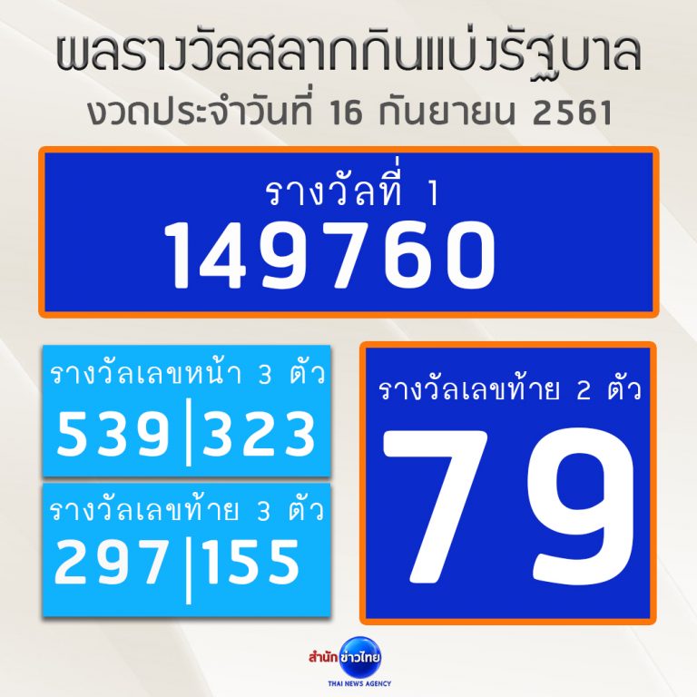 ผลรางวัลสลากกินแบ่งรัฐบาล งวดประจำวันที่ 16 กันยายน 2561
