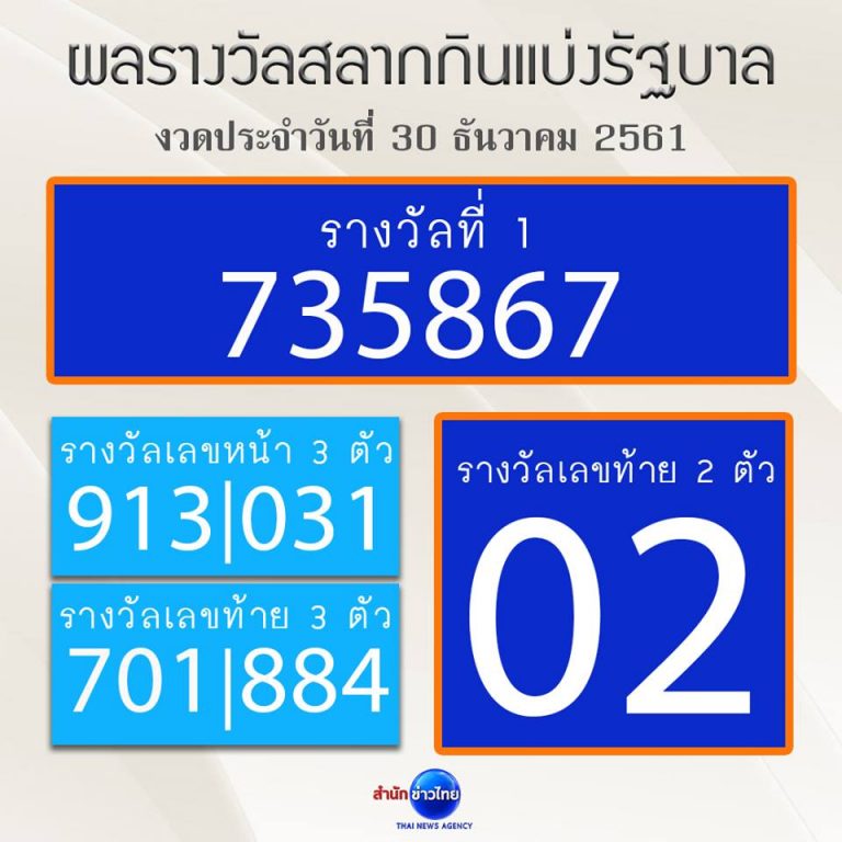 ผลรางวัลสลากกินแบ่งรัฐบาล งวดประจำวันที่ 30 ธันวาคม 2561