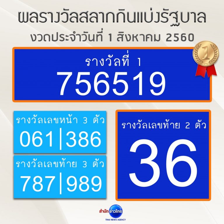 ผลรางวัลสลากกินแบ่งรัฐบาล งวดประจำวันที่ 1 สิงหาคม 2560