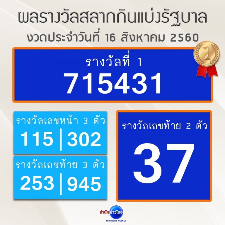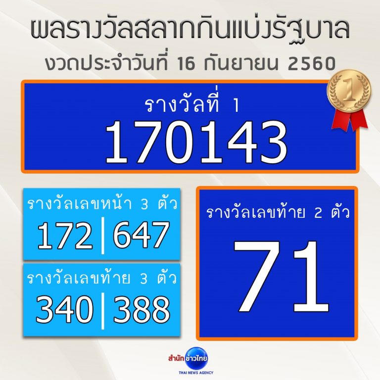 ผลรางวัลสลากกินแบ่งรัฐบาล งวดประจำวันที่ 16 กันยายน 2560