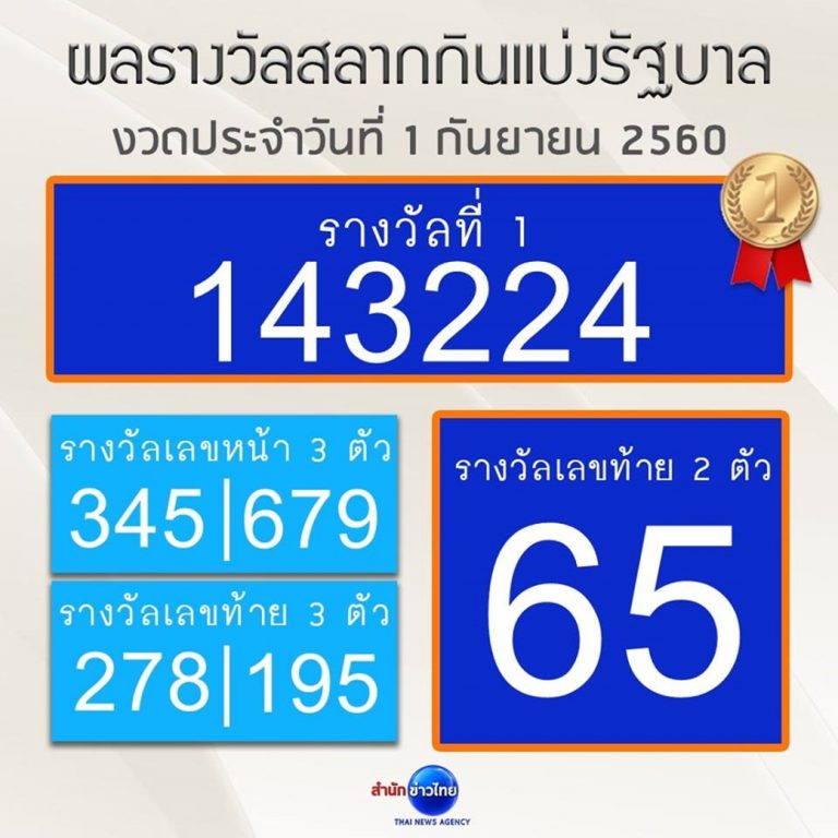 ผลรางวัลสลากกินแบ่งรัฐบาล งวดประจำวันที่ 1 กันยายน 2560