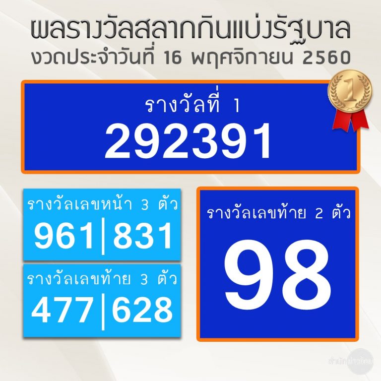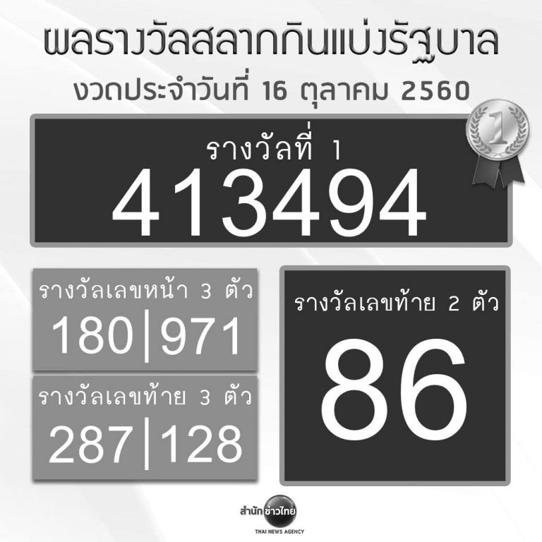 ผลรางวัลสลากกินแบ่งรัฐบาล งวดประจำวันที่ 16 ตุลาคม 2560