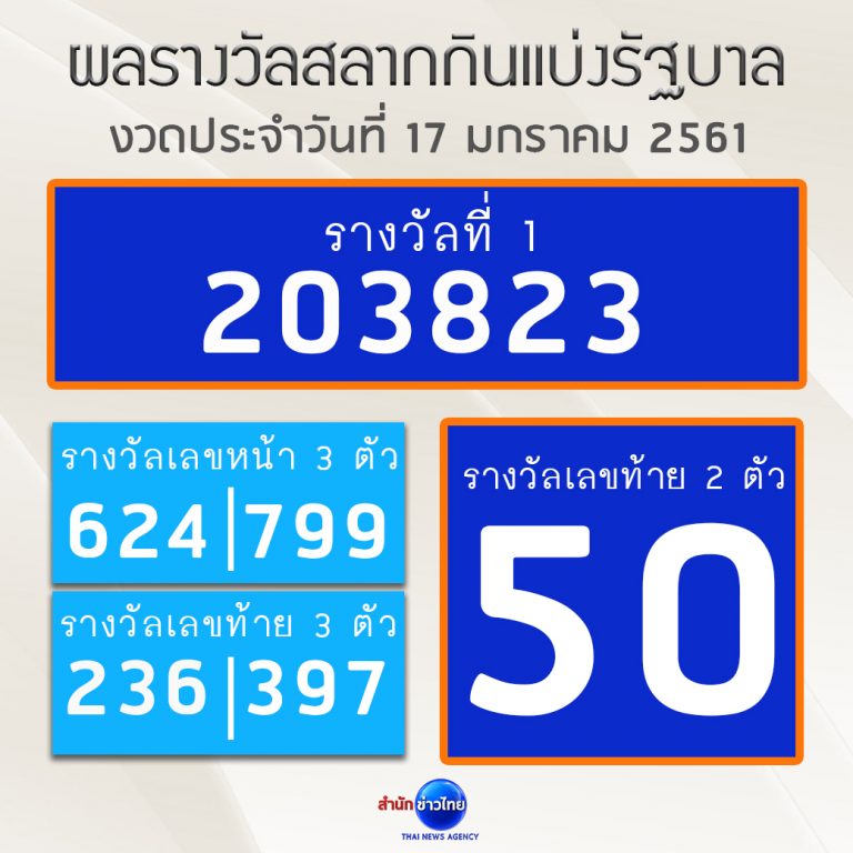ผลรางวัลสลากกินแบ่งรัฐบาล งวดประจำวันที่ 17 มกราคม 2561