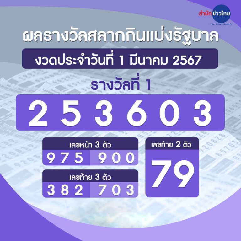 ผลรางวัลสลากกินแบ่งรัฐบาล งวดวันที่ 1 มีนาคม 2567
