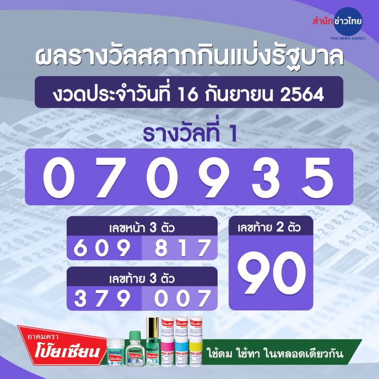 ผลรางวัลสลากกินแบ่งรัฐบาล งวดวันที่ 16 กันยายน 2564
